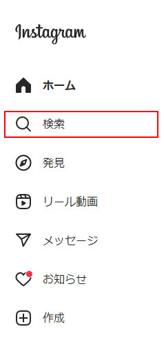 Instagramの検索フォームは、PC版であれば画面の左側の検索から、